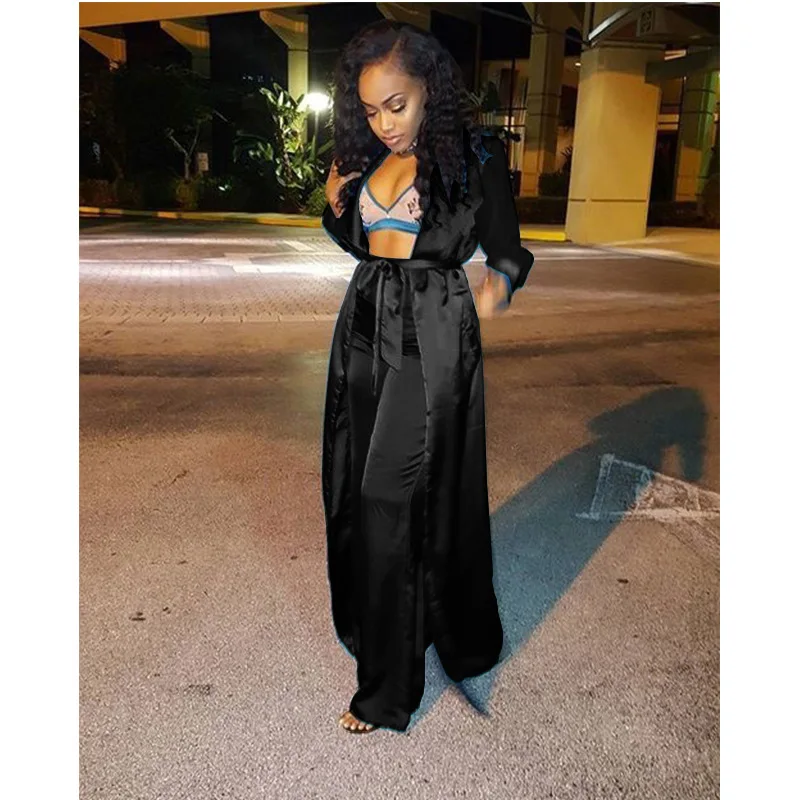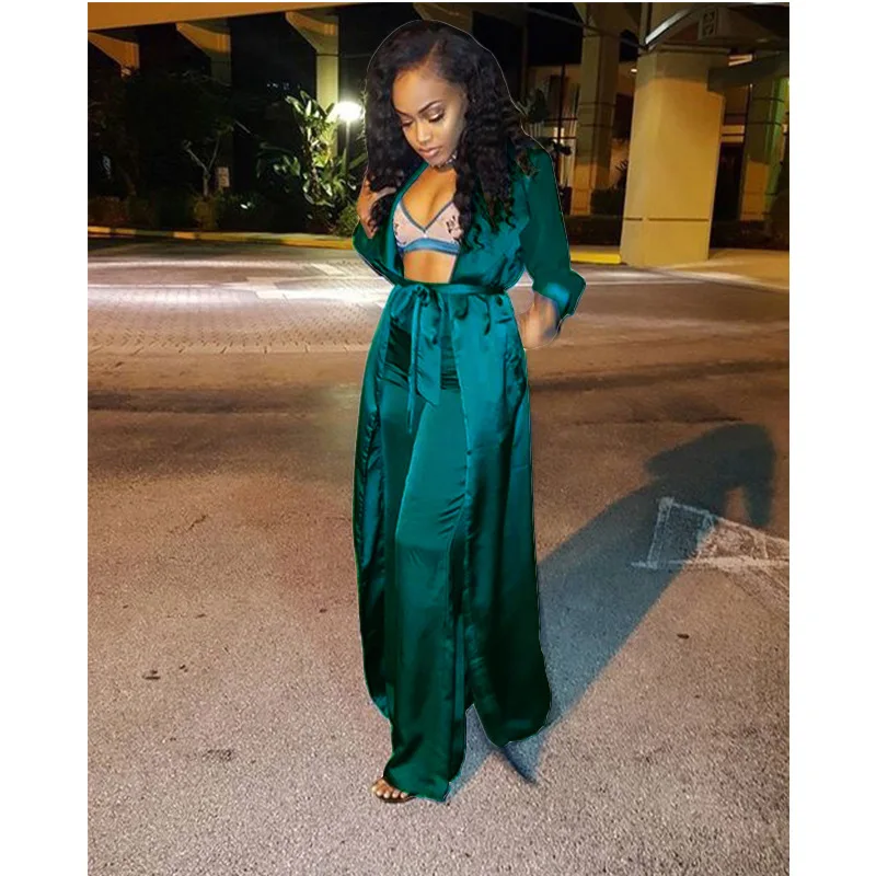 Images of Echoine Satin Two Piece Set Women Long Kimono Cardigan Trench Coat Wide Leg Pants 2 Piece Set Elegant Sexy Club Outfits Gold :